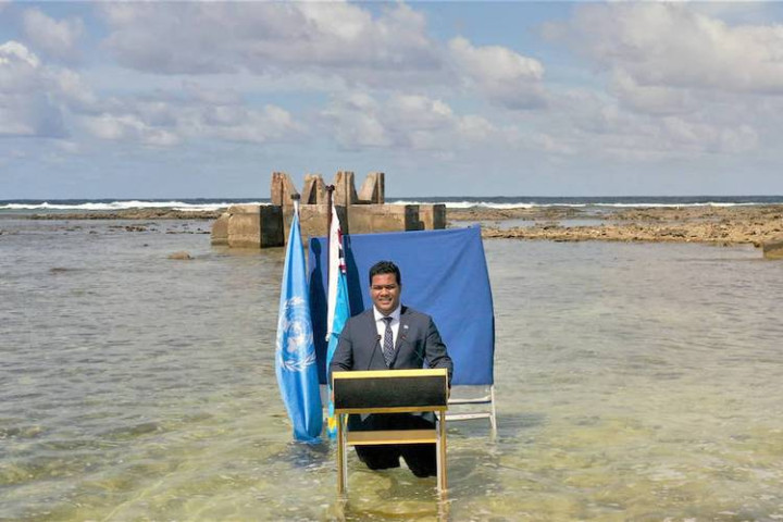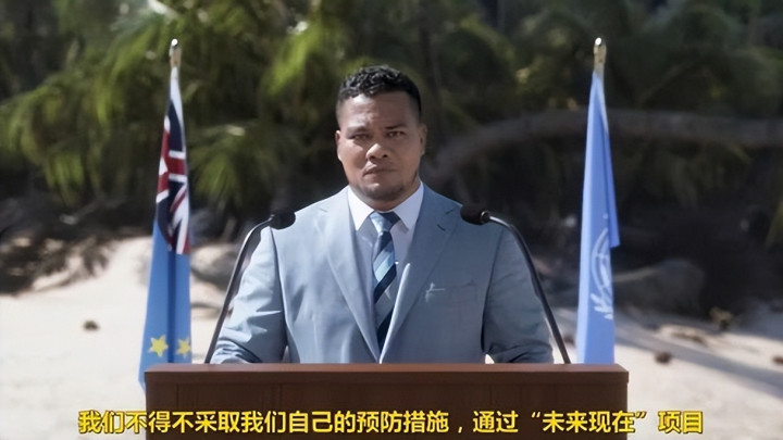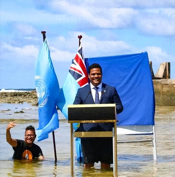2021年,时任外长西蒙·科费做出了一个让全世界静默的举动:他穿着西装,笔直地站在齐腰深的海水中,向气候峰会发表演讲。