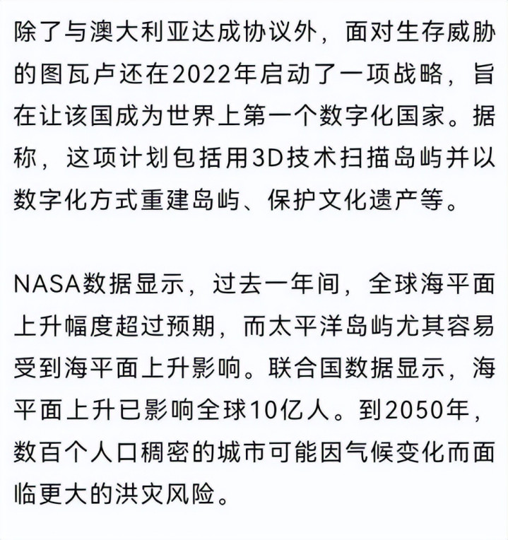 为了延续国民的生存与国家的存在,图瓦卢政府只能与澳大利亚签署协议,还启动 “数字国家” 计划。